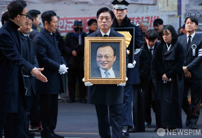 [서울=뉴스핌] 윤창빈 기자 = 31일 오전 서울 여의도 더불어민주당 중앙당사에서 엄수된 고(故) 이해찬 민주평화통일자문회의 수석부의장 노제에서 조승래 더불어민주당 사무총장이 영정을 들고 당사로 들어서고 있다. 2026.01.31 pangbin@newspim.com