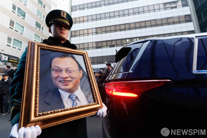 [서울=뉴스핌] 윤창빈 기자 = 31일 오전 서울 여의도 더불어민주당 중앙당사에서 엄수된 고(故) 이해찬 민주평화통일자문회의 수석부의장 노제에서 고인의 영정이 운구차로 향하고 있다. 2026.01.31 pangbin@newspim.com