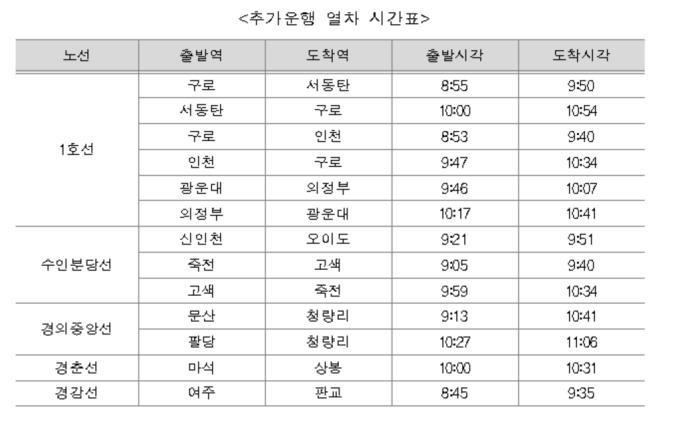 증편 대상은 수도권 전철 1호선(경부·경인·경원선)을 비롯해 수인분당선, 경의중앙선, 경춘선, 경강선 등 모두 5개 노선이다. 증편한 1호선의 경우 수도권 주요 간선 노선으로, 출근 시간대 혼잡이 특히 심할 것으로 예상돼 운행 횟수를 늘렸다.