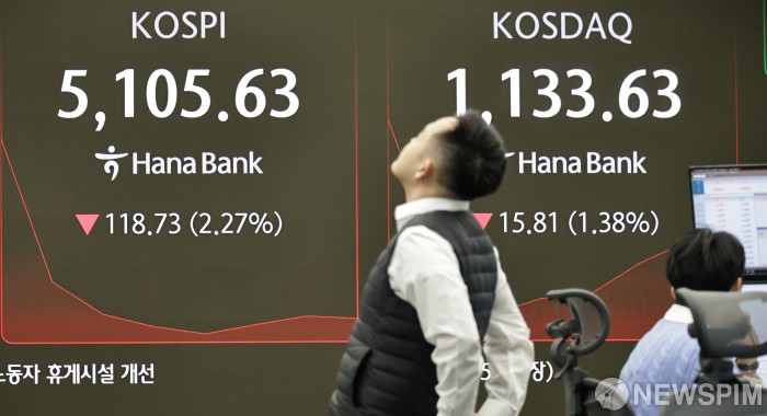 한국거래소에 따르면 이날 오전 9시 5분 기준 코스피 지수는 전 거래일 대비 134.92포인트(2.58%) 떨어진 5089.44에 거래되고 있다. 개인이 1조48억원 어치 사들이는 가운데 외국인과 기관은 각각 9455억원, 527억원 어치 팔아치우고 있다.