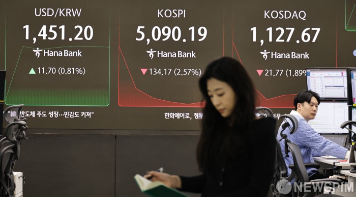 [서울=뉴스핌] 양윤모 기자 = 미국의 25% 관세 인상 가시화에 2일 오전 코스피가 전장 종가보다 134.17 포인트(2.57%) 하락하며 5090.19로, 코스닥은 21.77 포인트(1.89%) 하락한 1127.67으로 장을 시작한 가운데, 서울 중구 하나은행본점 딜링룸에서 직원들이 업무를 보고 있다. 서울외환시장에서 달러/원 환율은 전장 대비 11.70원 상승한 1451.20원에 주간거래를 시작했다. 2026.02.02 yym58@newspim.com