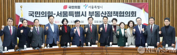 [서울=뉴스핌] 정일구 기자 = 송언석 국민의힘 원내대표와 오세훈 서울시장 등이 2일 오전 서울 여의도 국회에서 열린 국민의힘-서울특별시 부동산정책협의회에서 기념촬영을 하고 있다. 2026.02.02 mironj19@newspim.com