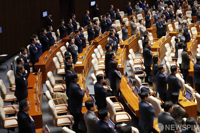 [서울=뉴스핌] 정일구 기자 = 2일 오후 서울 여의도 국회에서 열린 제432회 국회(임시회) 개회식에서 의원들이 국민의례를 하고 있다. 2026.02.02 mironj19@newspim.com