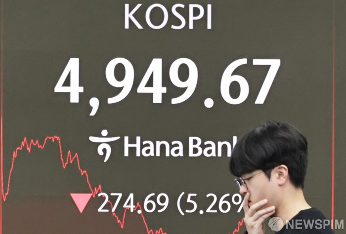 한국거래소에 따르면 2일 코스피 지수는 전 거래일 대비 274.69포인트(5.26%) 급락한 4949.67에 거래를 마쳤다. 개인이 5조6039억원을 순매수하며 방어에 나섰지만, 외국인과 기관은 각각 3조2575억원, 2조5173억원을 순매도하며 지수 하락을 주도했다. 코스닥 지수도 4.44% 하락하며 1098.36에 마감했다.