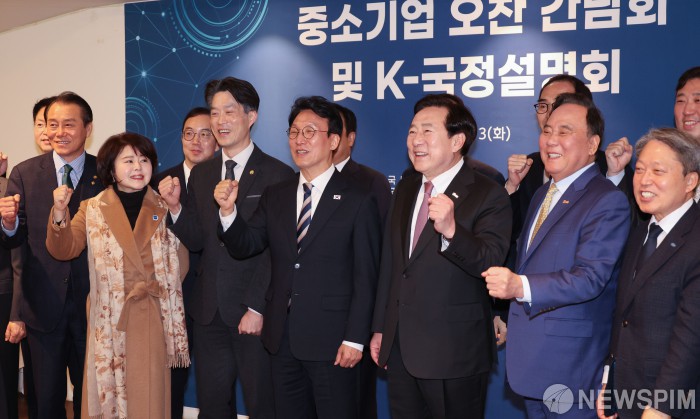 [서울=뉴스핌] 이길동 기자 =김민석 국무총리가 3일 서울 중구 달개비에서 열린 '중소기업 오찬 간담회 및 K-국정설명회'에서 기업인들과 기념촬영을 하고 있다. 2026.02.03 gdlee@newspim.com