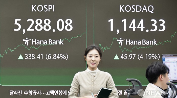 [서울=뉴스핌] 양윤모 기자 = 3일 오후 외국인과 기관의 매수속에 코스피가 전장 종가보다 338.41 포인트(6.84%) 상승하며 5228.08로, 코스닥은 45.97 포인트(4.19%) 상승한 1144.33으로 장을 마감한 가운데, 서울 중구 하나은행본점 딜링룸에서 직원들이 업무를 보고 있다. 서울외환시장에서 달러/원 환율은 전장 대비 17.60원 하락한 1446.70원에 주간거래를 마감했다. 2026.02.03 yym58@newspim.com