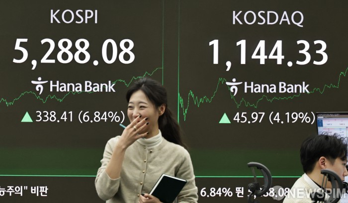 [서울=뉴스핌] 양윤모 기자 = 3일 오후 외국인과 기관의 매수속에 코스피가 전장 종가보다 338.41 포인트(6.84%) 상승하며 5228.08로, 코스닥은 45.97 포인트(4.19%) 상승한 1144.33으로 장을 마감한 가운데, 서울 중구 하나은행본점 딜링룸에서 직원들이 업무를 보고 있다. 서울외환시장에서 달러/원 환율은 전장 대비 17.60원 하락한 1446.70원에 주간거래를 마감했다. 2026.02.03 yym58@newspim.com