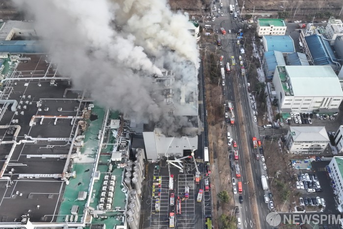 [시흥=뉴스핌] 류기찬 기자 = 3일 오후 경기 시흥시 정왕동 SPC삼립 시화공장에서 화재가 발생해 소방대원들이 진화 작업을 벌이고 있다. 소방당국은 대응 1단계를 발령하고 펌프차 등 장비와 인력을 투입해 불길을 잡고 있다. 2026.02.03 ryuchan0925@newspim.com