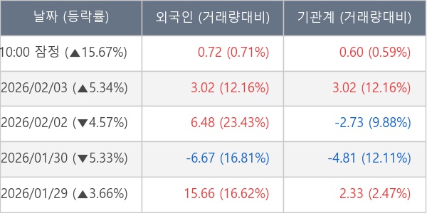 [서울=뉴스핌] 로보뉴스 = 04일 10시 15분 현재 한전기술(052690)은 외국인과 기관이 각각 0.72 만 주, 0.60 만 주 순매수(잠정) 하면서 전일 대비 15.67% (현재가 152,800원) 상승하고 있다.