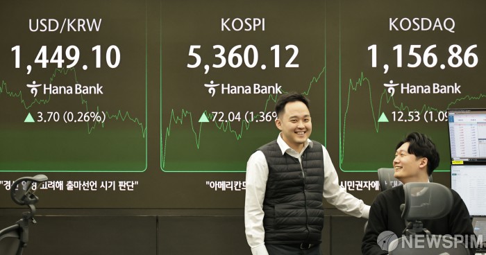 [서울=뉴스핌] 양윤모 기자 = 4일 오전 코스피가 전장 종가보다 72.04 포인트(1.36%) 상승하며 5360.12로, 코스닥은 12.53 포인트(1.09%) 상승한 1156.86 으로 거래되는 가운데, 서울 중구 하나은행본점 딜링룸에서 직원들이 업무를 보고 있다. 서울외환시장에서 달러/원 환율은 전장 대비 3.70원 상승한 1449.10원에 주간거래를 하고있다. 2026.02.04 yym58@newspim.com