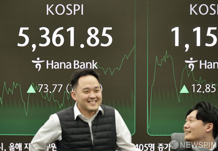 [서울=뉴스핌] 양윤모 기자 = 4일 오전 코스피가 전장 종가보다 73.77 포인트(1.40%) 상승하며 5361.85로, 코스닥은 12.53 포인트(1.09%) 상승한 1156.86 으로 거래되는 가운데, 서울 중구 하나은행본점 딜링룸에서 직원들이 업무를 보고 있다. 서울외환시장에서 달러/원 환율은 전장 대비 3.70원 상승한 1449.10원에 주간거래를 하고있다. 2026.02.04 yym58@newspim.com