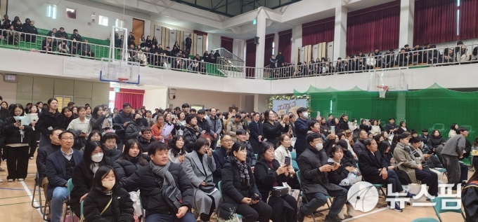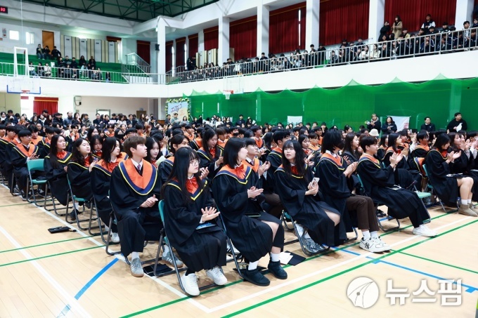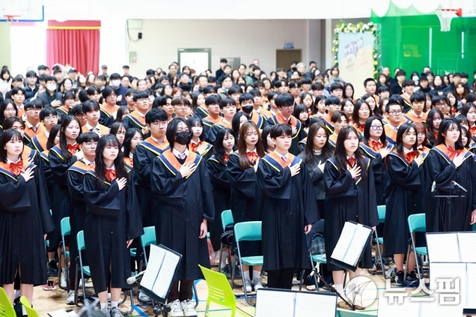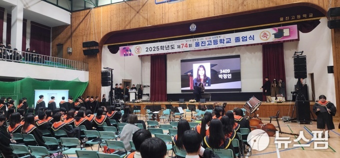 [울진=뉴스핌] 남효선 기자 = 3일 경북 울진군 울진읍 소재 울진고등학교 연호체육관에서 열린 '2025학년도 제74회 졸업식'에서 졸업생들이 졸업 가운을 입고 환한 얼굴로 졸업식을 치르고 있다. 이날 130명의 학생들이 졸업식을 끝으로 꿈을 키우던 교정을 떠나 '빛나는 청춘의 세계'로 들어갔다. 울진고등학교는 한국전쟁 기간인 지난 1951년 8월 30일 울진농업고등학교로 설립 인가를 받은 후 1996년 11월, 울진종합고등학교로 학칙을 변경하고 1999년 3월 1일 울진여자고등학교와 통합해 울진고등학교로 교명을 변경했다. 1953년 3월 23일 112명의 첫 졸업생을 배출한 이래 2024학년도 기준 1만 7206명의 동량(棟樑)을 길러냈다. 지난 2011년 8월 17일 경북도교육청으로부터 자율형 공립고등학교로 지정된 후 2025년 3월 1일 '자율형 공립고 2.0' 운영학교로 지정되는 등 울진지역의 대표적 명문 고등학교로 자리매김하고 있다. 울진고등학교는 졸업식을 거행하는 동안 대형 영상에 졸업생들의 얼굴을 하나하나 담아 성인의 단계로 나아가는 통과의례의 의미를 부각했다. 이날 졸업식에는 학생들과 졸업생 학부모, 교사, 동문들이 대거 참석해 '푸르른 청춘의 바다'로 나아가는 학생들을 축하하고 격려했다.