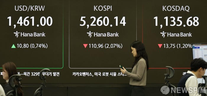 [서울=뉴스핌] 양윤모 기자 = 인공지능(AI) 관련 주식의 고평가 논란속 뉴욕증시가 혼조 마감한 5일 오전 코스피가 전장 종가보다 110.96 포인트(2.07%) 하락하며 5260.14로, 코스닥은 13.75 포인트(1.20%) 하락한 1135.68 로 거래를 시작한 가운데, 서울 중구 하나은행본점 딜링룸에서 직원들이 업무를 보고 있다. 서울외환시장에서 달러/원 환율은 전장 대비 10.80원 상승한 1461.00원에 주간거래를 시작했다. 2026.02.05 yym58@newspim.com