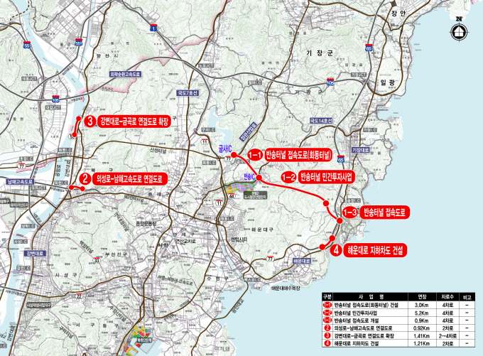이번에 포함된 사업은 총 6천539억 원 규모로 ▲반송터널▲의성로~남해고속도로 연결도로▲강변대로~금곡로 연결도로 확장▲해운대로 지하차도 건설 등 4개다.