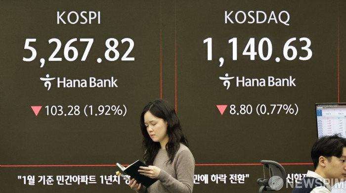 [서울=뉴스핌] 양윤모 기자 = 인공지능(AI) 관련 주식의 고평가 논란속 뉴욕증시가 혼조 마감한 5일 오전 코스피가 전장 종가보다 103.28 포인트(1.92%) 하락하며 5267.82로, 코스닥은 8.80 포인트(0.77%) 하락한 1140.63으 로 거래를 시작한 가운데, 서울 중구 하나은행본점 딜링룸에서 직원들이 업무를 보고 있다. 서울외환시장에서 달러/원 환율은 전장 대비 10.40원 상승한 1460.60원에 주간거래를 시작했다. 2026.02.05 yym58@newspim.com