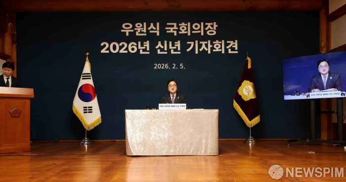 [서울=뉴스핌] 윤창빈 기자 = 우원식 국회의장이 5일 오전 국회 사랑재에서 신년 기자회견을 하고 있다. 2026.02.05 pangbin@newspim.com
