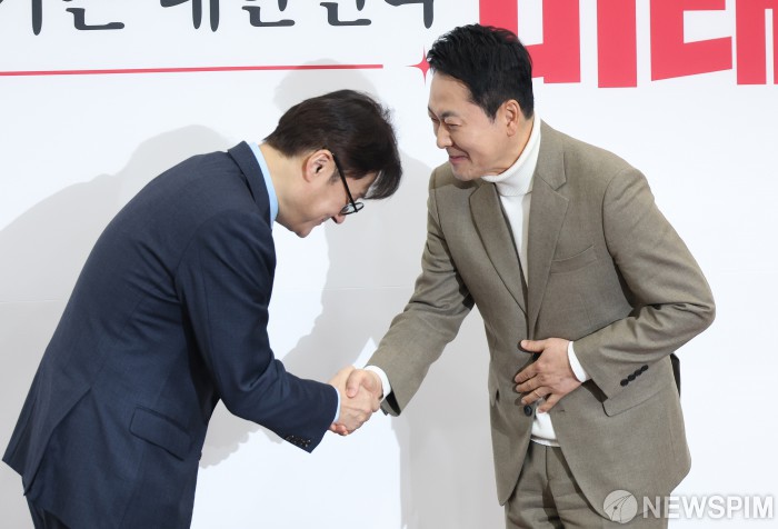 [서울=뉴스핌] 정일구 기자 = 장동혁 국민의힘 대표가 5일 오전 서울 여의도 국회에서 홍익표 청와대 정무수석을 접견하며 악수하고 있다. 2026.02.05 mironj19@newspim.com