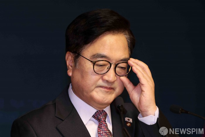 [서울=뉴스핌] 윤창빈 기자 = 우원식 국회의장이 5일 오전 국회 사랑재에서 신년 기자회견을 하던 중 안경을 고쳐쓰고 있다. 2026.02.05 pangbin@newspim.com