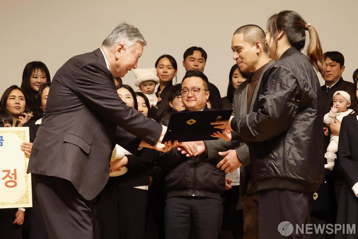 [서울=뉴스핌] 류기찬 기자 = 이중근 부영그룹 회장이 5일 오전 서울 중구 부영태평빌딩에서 열린 2026년 부영그룹 시무식 및 출산장려지원·19단 경연대회에서 출산장려금 지급증서를 임직원에게 전달하고 있다. 2026.02.05 ryuchan0925@newspim.com