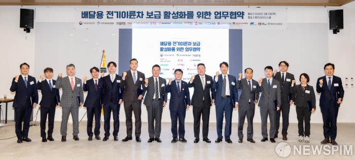 [서울=뉴스핌] 김성환 기후에너지환경부 장관이 5일 경기도 하남시 소재 배민라이더스쿨에서 배달용 전기이륜차 보급 활성화 업무협약을 체결하고 기념촬영을 하고 있다. (왼쪽부터 LG에너지솔루션 김재권 마케팅 그룹장, 바로고 조병익 CPO, 생각대로 채헌진 대표이사, 부릉(주) 채윤서 대표이사, 요기요 권효준 ESG총괄본부장, 쿠팡이츠서비스(유) 유성훈 기획조정본부장, 우아한 형제들 윤석준 총괄사장, 기후에너지환경부 김성환 장관, 대동 모빌리티 원유현 대표이사, 디앤에이모터스 이상윤 대표이사, KR모터스 임종선 소장, 무빙 이정민 대표, 기후에너지환경부 정선화 녹색전환정책관, 배달서비스공제조합 동정한 이사장, 한국자동차환경협회 정종선 회장)[사진= 기후에너지환경부 ] 2026.02.05 photo@newspim.com