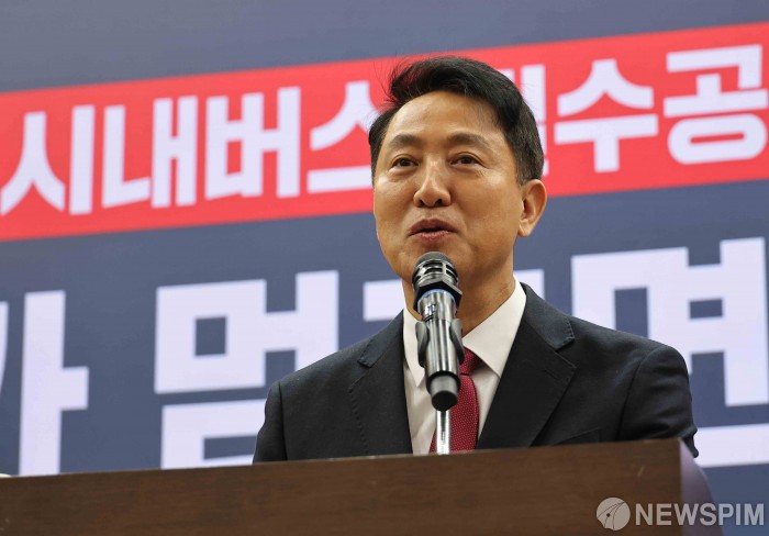 [서울=뉴스핌] 윤창빈 기자 = 토론회를 공동 주최한 오세훈 서울시장이 5일 서울 여의도 국회 의원회관에서 열린 시내버스 필수공익사업 지정 토론회에서 인사말을 하고 있다. 2026.02.05 pangbin@newspim.com