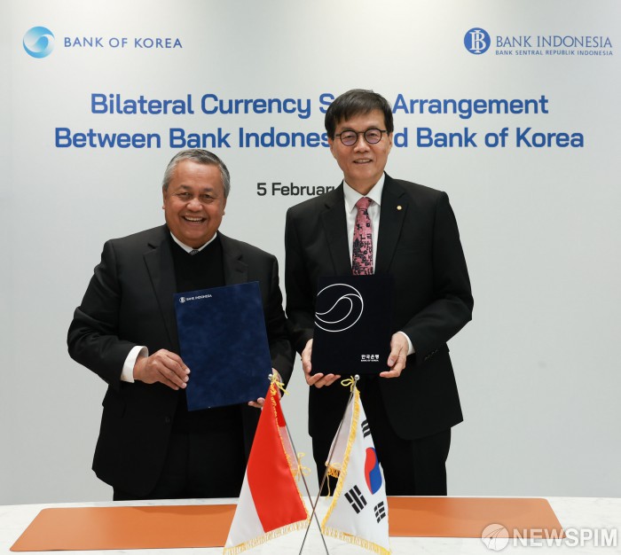 [서울=뉴스핌]이창용 한국은행 총재(오른쪽)와 페리 와르지요(Perry Warjiyo) 인도네시아 중앙은행 총재가 5일 오전 서울 중구 한국은행에서 통화스왑 계약 연장 합의서에 서명 후 기념촬영을 하고 있다.[사진= 한국은행 ] 2026.02.05 photo@newspim.com