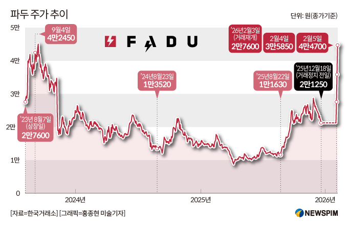 한국거래소에 따르면 파두는 지난해 12월 19일 2만1250원에서 거래가 정지된 뒤, 이달 3일 2만7600원으로 거래를 재개했다. 이후 4일에는 3만5850원, 5일에는 4만4700원(장중 4만6600원)까지 오르며 3거래일 만에 약 85% 급등했다. 시가총액도 거래 정지 직전 약 1조원 수준에서 거래 재개 이후 2조원을 웃도는 수준까지 불어나며 단기간에 1조원 이상 증가했다.