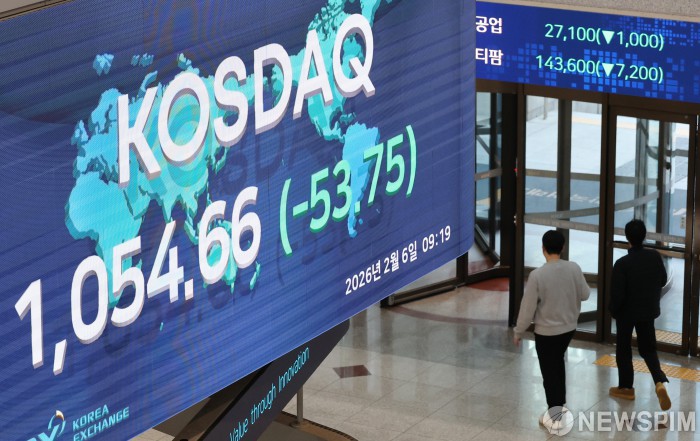 [서울=뉴스핌] 이형석 기자 = 6일 오전 코스닥이 31.33 포인트(2.83%) 하락한 1077.08로 거래를 시작했다. 서울 여의도 한국거래소 전광판에 코스닥 지수가 표시되고 있다. 2026.02.06 leehs@newspim.com