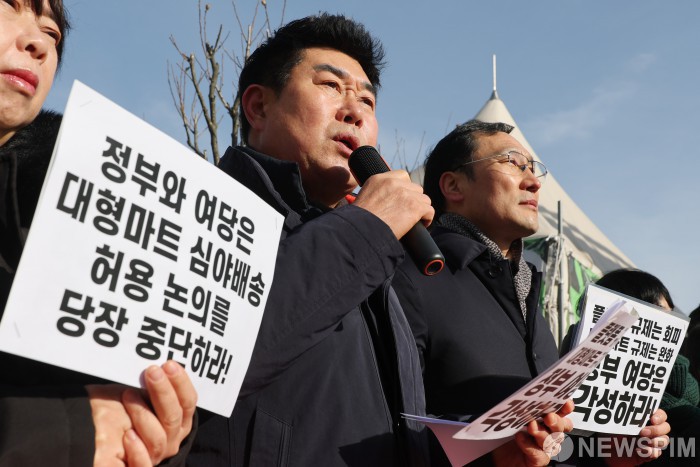 [서울=뉴스핌] 이형석 기자 = 한국중소상인자영업자총연합회, 전국서비스산업노동조합연맹, 전국택배노동조합 등 단체들이 6일 오전 서울 여의도 국회 앞에서 정부 - 여당의 대형마트 새벽배송 허용 규탄 기자회견을 열고 있다. 2026.02.06 leehs@newspim.com