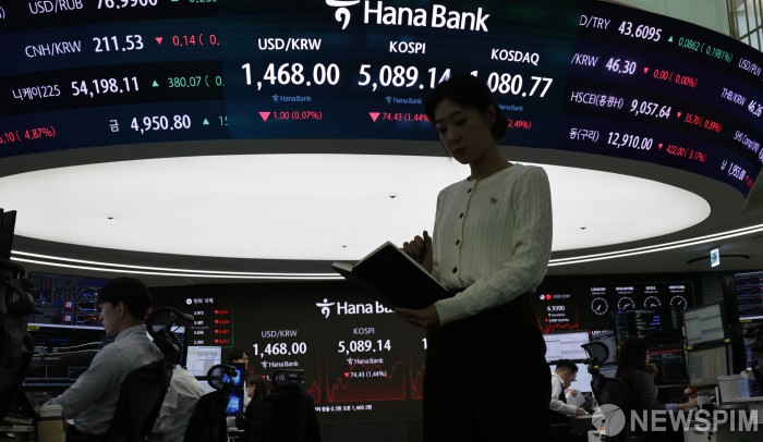 [서울=뉴스핌] 양윤모 기자 = 6일 오후 코스피가 전장 종가보다 74.43 포인트(1.44%) 하락하며 5089.14로, 코스닥은 27.64 포인트(2.49%) 하락한 1080.77 로 거래를 마감한 가운데, 서울 중구 하나은행본점 딜링룸에서 직원들이 업무를 보고 있다. 서울외환시장에서 달러/원 환율은 전장 대비 1.00원 하락한 1468.00원에 주간거래를 마감했다. 2026.02.06 yym58@newspim.com