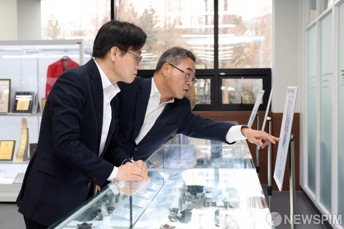 [서울=뉴스핌] 김정관 산업통상부 장관이 6일 오전 경남 창원시 ㈜삼현 대회의실에서 열린 AX 실증산단 참여기업 간담회에서 AX 적용 사례 제품을 확인하고 있다. [사진=산업통상부] 2026.02.06 photo@newspim.com