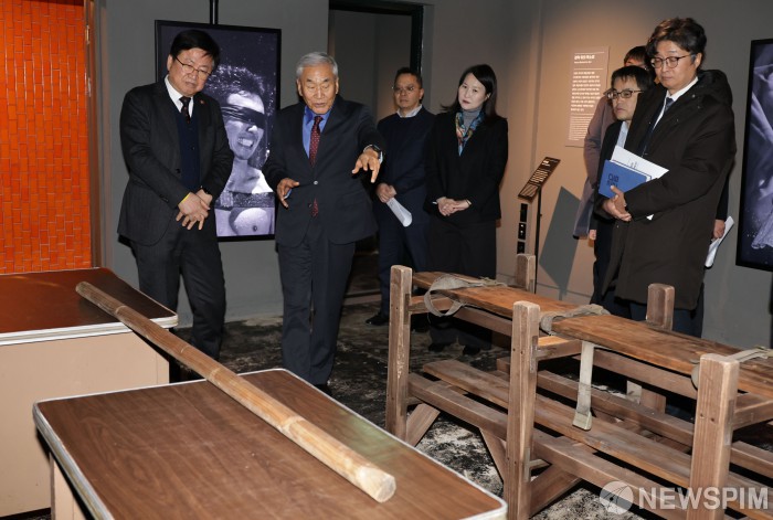 [서울=뉴스핌] 양윤모 기자 = 이재오 민주화운동기념사업회 이사장이 6일 오후 서울 용산구 민주화운동기념관에서 개최된 민주화운동기념사업회와 '민주주의 역사교육 활성화를 위한 업무협약(MOU)식'에 참석해 최교진 교육부 장관과 라운딩을 하며 고문시설을 설명하고 있다. 행사에는 최교진 교육부 장관과 이재오 민주화운동기념사업회 이사장이 참석했으며 민주화운동기념사업회는 교육부와 협력해 온라인 역사교육 자료 보관소(아카이브) 구축을 위한 사료 제공, 초·중등 교원 연수, 학생 역사교육 현장 체험학습의 활성화 등을 지원할 예정이다. 2026.02.06 yym58@newspim.com