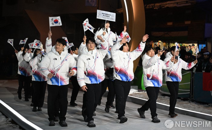 [코르티나담페초=로이터뉴스핌] 6일 이탈리아 코르티나담페초에서 열린 2026 밀라노-코르티나 동계 올림픽 개막식에서 대한민국 선수단이 입장하고 있다. 2026.02.07 photo@newspim.com