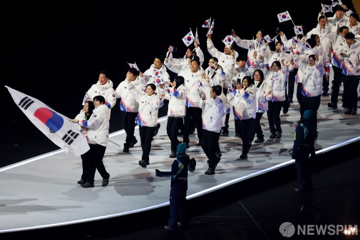 [코르티나담페초=로이터뉴스핌] 6일 이탈리아 코르티나담페초에서 열린 2026 밀라노-코르티나 동계 올림픽 개막식에서 대한민국 선수단이 입장하고 있다. 2026.02.07 photo@newspim.com