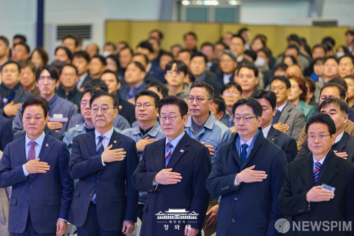 [서울=뉴스핌] 이재명 대통령이 지난 6일 경남 거제시 견내량 인근에서 열린 남부내륙철도 착공식에서 국기에 대한 경례를 하고 있다. [사진=청와대] 2026.02.07 photo@newspim.com