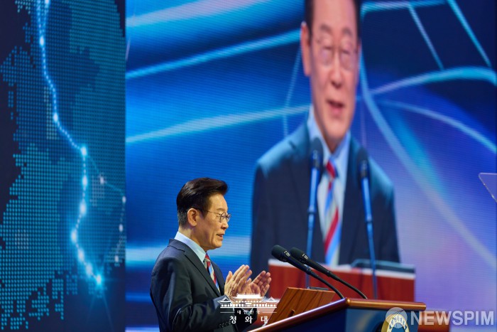 [서울=뉴스핌] 이재명 대통령이 지난 6일 경남 거제시 견내량 인근에서 열린 남부내륙철도 착공식에서 발언을 하고 있다. [사진=청와대] 2026.02.07 photo@newspim.com
