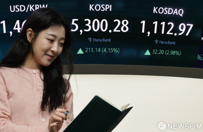 [서울=뉴스핌] 양윤모 기자 = 9일 오전 코스피가 전장 종가보다 211.14 포인트(4.15%) 상승하며 5300.28 로, 코스닥은 32.20 포인트(2.98%) 상승한 1112.97 로 거래를 시작한 가운데, 서울 중구 하나은행본점 딜링룸에서 직원들이 업무를 보고 있다. 서울외환시장에서 달러/원 환율은 전장 대비 6.70원 하락한 1462.80원에 주간거래를 시작했다. 2026.02.09 yym58@newspim.com