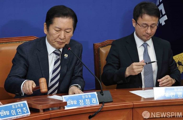 [서울=뉴스핌] 윤창빈 기자 = 정청래 더불어민주당 대표가 9일 오전 서울 여의도 국회에서 열린 최고위원회의에서 의사봉을 두드리고 있다. 2026.02.09 pangbin@newspim.com