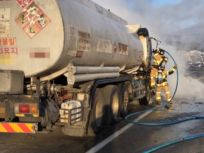 이날 사고는 1번 국도 천안방향 유정2교 인근에서 20t 화물차와 승용차, 탱크로리가 추돌하면서 발생했다. 추돌 후 화재가 발생해 승용차가 전소됐으며 탱크로리 운전석이 소실됐다.