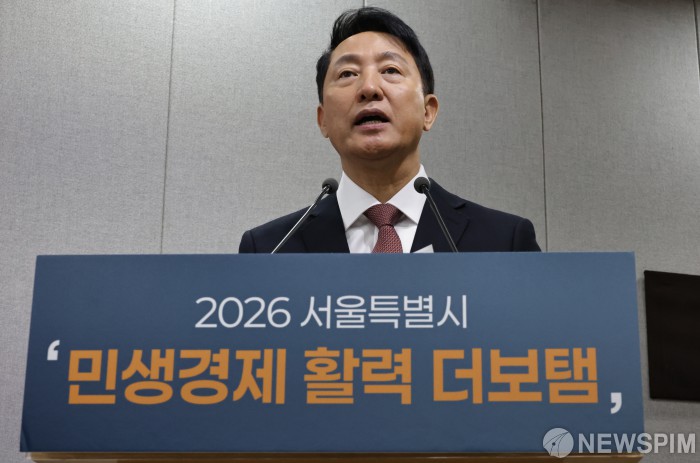 [서울=뉴스핌] 양윤모 기자 = 오세훈 서울시장이 9일 오전 서울시청 브리핑룸에서 개최된 '2026 민생경제 활력 더보탬'기자설명회에 참석해 발표를 하고 있다. 서울시는 총 2조7906억원을 지원해 소상공인, 골목 상권, 소비자, 취약 노동자 등 경제 불황 속 가장 먼저 위기에 직면하는 4대 계층에 대한 활력 회복을 주요 내용으로 하는 '2026년 민생경제 활력 더보탬'을 발표했다. 2026.02.09 yym58@newspim.com