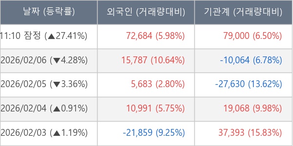 [서울=뉴스핌] 로보뉴스 = 09일 11시 30분 현재 대주전자재료(078600)는 외국인과 기관이 각각 7.27 만 주, 7.90 만 주 순매수(잠정) 하면서 전일 대비 27.41% (현재가 91,100원) 상승하고 있다.