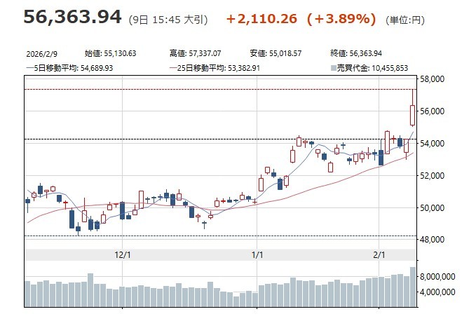 [서울=뉴스핌] 오영상 기자 = 9일 닛케이주가는 전일 치러진 총선에서 여당이 압승을 거두며 정책 추진에 대한 기대감이 높아지면서 급등했다. 주가는 3일에 기록했던 종전 최고치(5만4720엔)를 크게 웃돌며, 사상 처음으로 5만6000엔대에서 거래를 마쳤다.