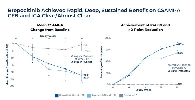 16주간 진행된 연구에서 환자들은 브레포시티닙 45mg, 15mg 또는 위약을 3:2:2 비율로 무작위 배정받았다. 특히 45mg 투여군에는 장기간 질환을 앓고 치료가 어려운 환자들이 다수 포함됐음에도, 여러 평가 지표에서 100% 반응률을 기록했다.