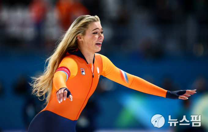 [밀라노 로이터=뉴스핌] 장환수 스포츠전문기자= 네덜란드의 유타 레이르담이 10일 스피드스케이팅 여자 1000m에서 올림픽 신기록으로 우승한 뒤 환호하고 있다. 2026.02.10 zangpabo@newspim.com