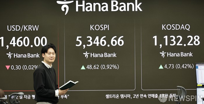 [서울=뉴스핌] 양윤모 기자= 뉴욕증시의 3대 주가지수가 강세를 이어간 10일 오전 코스피가 전장 종가보다 48.62 포인트(0.92%) 상승하며 5346.66 으로, 코스닥은 4.73 포인트(0.42%) 상승한 1132.28 로 거래를 시작한 가운데, 서울 중구 하나은행본점 딜링룸에서 직원들이 업무를 보고 있다. 서울외환시장에서 달러/원 환율은 전장 대비 0.30원 하락한 1460.00원에 주간거래를 시작했다. 2026.02.10 yym58@newspim.com