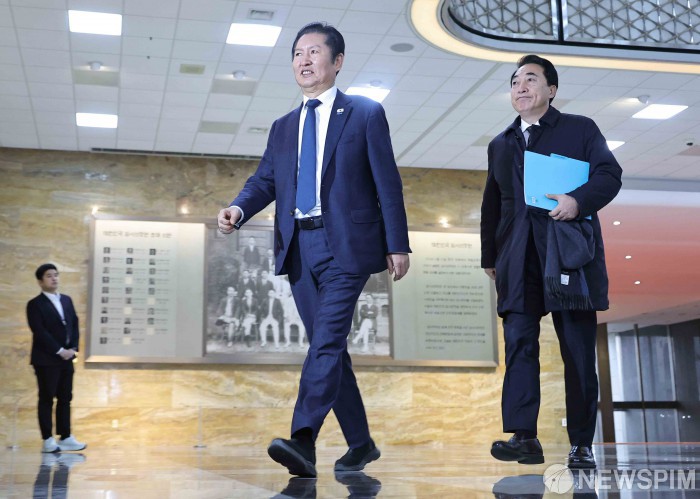 [서울=뉴스핌] 윤창빈 기자 = 정청래 더불어민주당 대표, 박수현 수석대변인이 10일 오전 서울 여의도 국회에서 열린 조국혁신당 합당과 관련한 비공개 의원총회에 참석하고 있다. 2026.02.10 pangbin@newspim.com