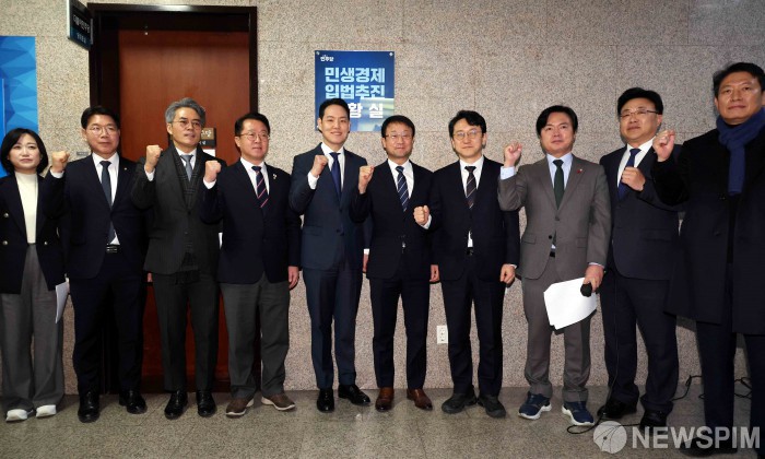 [서울=뉴스핌] 윤창빈 기자 = 한병도 더불어민주당 원내대표와 김한규 원내정책수석부대표를 비롯한 참석자들이 10일 오전 서울 여의도 국회에서 민생경제 입법추진 상황실 현판식을 하고 있다. 2026.02.10 pangbin@newspim.com