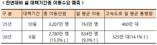 한국교통연구원의 '설 연휴 통행 설문조사'에 따르면 이번 대책기간 동안 중복 이동 포함 총 2780만명이 이동할 예정이다. 일 평균 834만 명 이동할 예정이며 국민의 31.4%는 여행을 계획 중인 것으로 예상됐다. 지난해 설 대책기간에 비해 총 이동인원은 13.3% 감소하지만 연휴기간이 짧아진 영향으로 일 평균 이동인원은 9.3% 증가할 것으로 분석됐다.