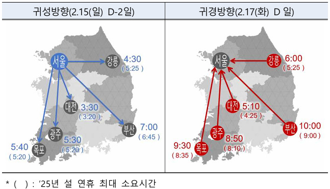 주요 도시간 이동 시간은 귀성은 15일 일요일 오전, 귀경은 17일 화요일 오후가 가장 혼잡할 것으로 예측되고 있다. 이동 시간도 지난해보다 대부분 증가할 것으로 예상된다. 서울~부산의 경우 귀성길 소요시간은 7시간으로 지난해(6시간 45분)보다 늘어날 예정이며 귀경길은 10시간이 걸릴 것으로 예측되고 있다. 서울~목포구간의 경우 귀성길은 5시간 40분, 귀경길은 9시간 30분이 각각 소요될 전망이다.