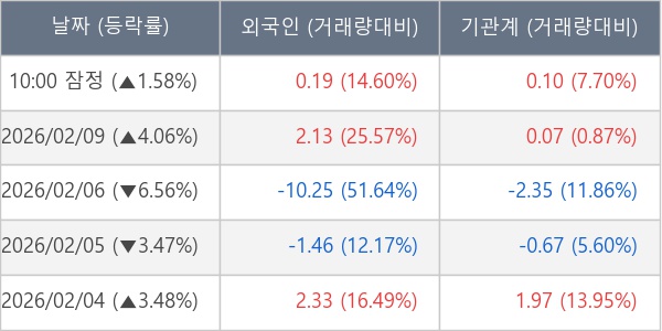 [서울=뉴스핌] 로보뉴스 = 10일 10시 15분 현재 롯데정밀화학(004000)은 외국인과 기관이 각각 0.19 만 주, 0.10 만 주 순매수(잠정) 하면서 전일 대비 1.58% (현재가 48,150원) 상승하고 있다.